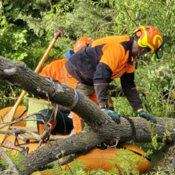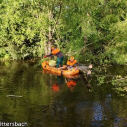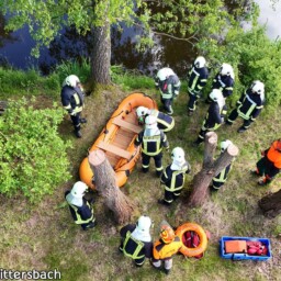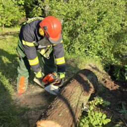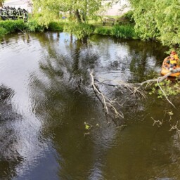 Im Mittelpunkt stand ein Baum, der dort seit einigen Wochen im Wasser lag. Die Situation war ideal, um mehrere Themen direkt vor Ort zu trainieren: den sicheren Umgang mit der Kettensäge, das Arbeiten vom Schlauchboot aus und den Einsatz der Seilwinde des SW2000 (Schlauchwagen 2000), den unsere Kameraden aus Frankenberg mitgebracht haben.