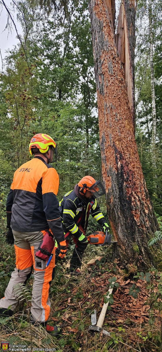 Unser Kamerad und Ausbilder André schulte die Anwesenden im Umgang mit der Säge, insbesondere beim Bearbeiten unter Spannung stehender Bäume.