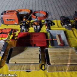 Der diensthabende Ausbilder überraschte uns mit hydraulischem Rettungsgerät, einmal mit Hydraulikaggregat und Verbrennungsmotor und einmal in akkubetriebener Ausführung, jeweils mit Schere, Spreizer und dem dazugehörigen Zubehör.