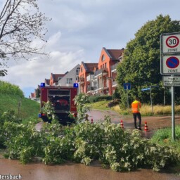 Unser Leiter Bauhof bat um Amtshilfe, da eine größere Baum/ Strauchgruppe auf die Fahrbahn gefallen war bzw. weitere Bäume drohten auf die Straße zu kippen.