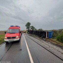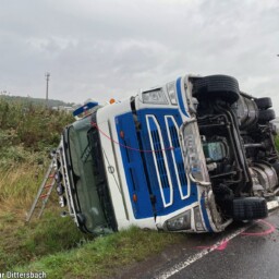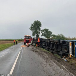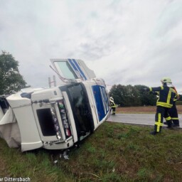 Laut Meldung war ein LKW von der Straße abgekommen und umgekippt. Fahrer sollte sich noch im Fahrerhaus befinden.
